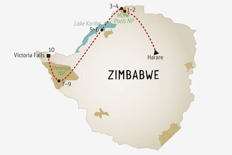 7. Tag: Hwange Nationalpark–Victoria Falls. Nach dem Frühstück werden Sie zur Flugbahn gefahren, wo Sie ein Kleinflugzeug besteigen. Sie fliegen über den Park bis nach Victoria Falls, wo Sie wiederum abgeholt werden für den Transfer in die Stadt. Der Rest des Tages steht zur freien Verfügung. Übernachtung Batonka Guest Lodge o. ä. (F)